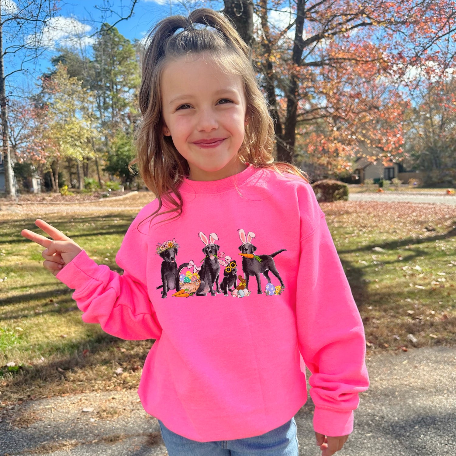 Hop into spring with SEF's Easter Youth Sweatshirts Featuring Black Labradors hilariously dressed as Easter bunnies, each design is hand-drawn by Samantha herself, adding a personal touch to your holiday wardrobe. Not only is it adorable, but it's also as soft as a bunny's fur, ensuring maximum comfort while you spread Easter cheer! šøš¶š°