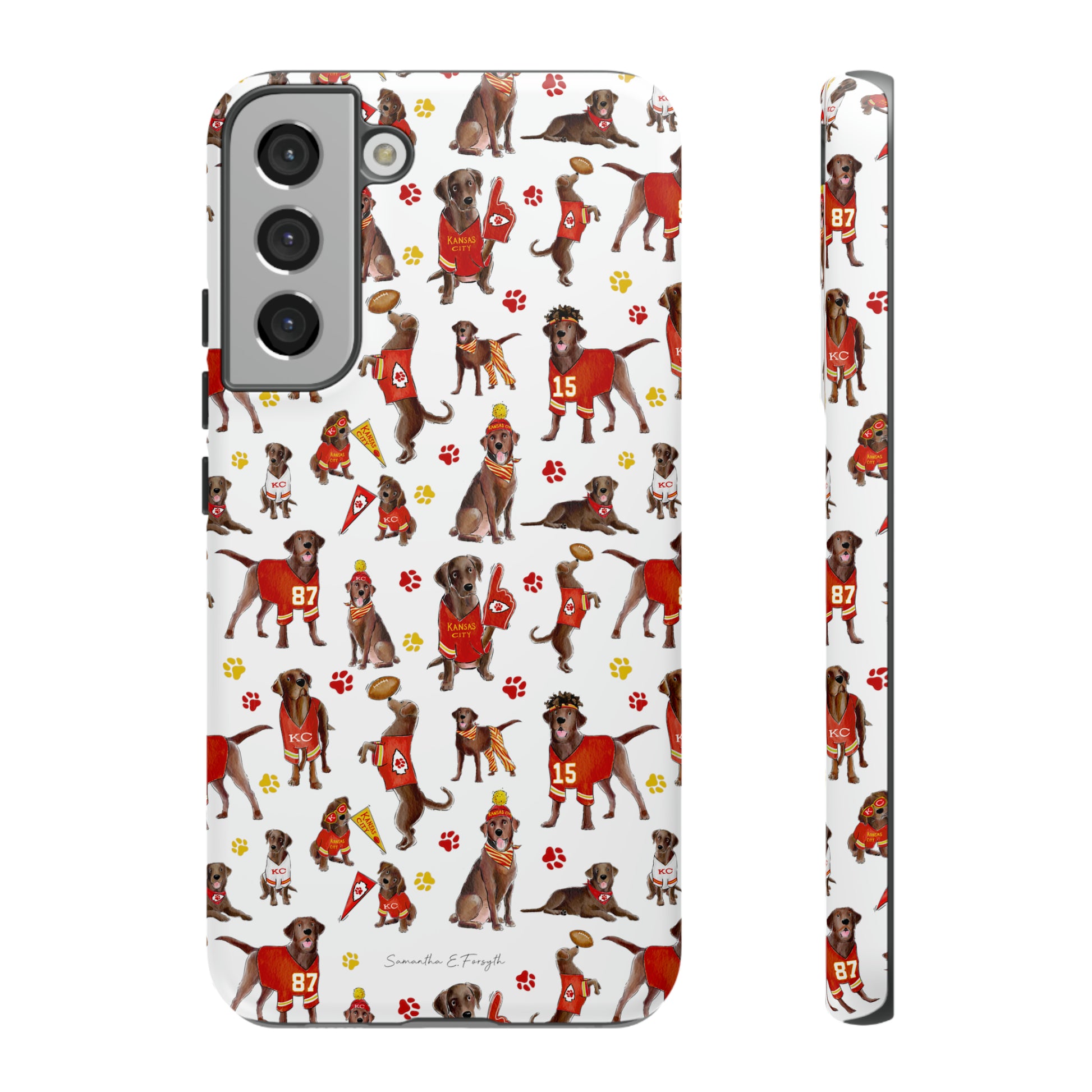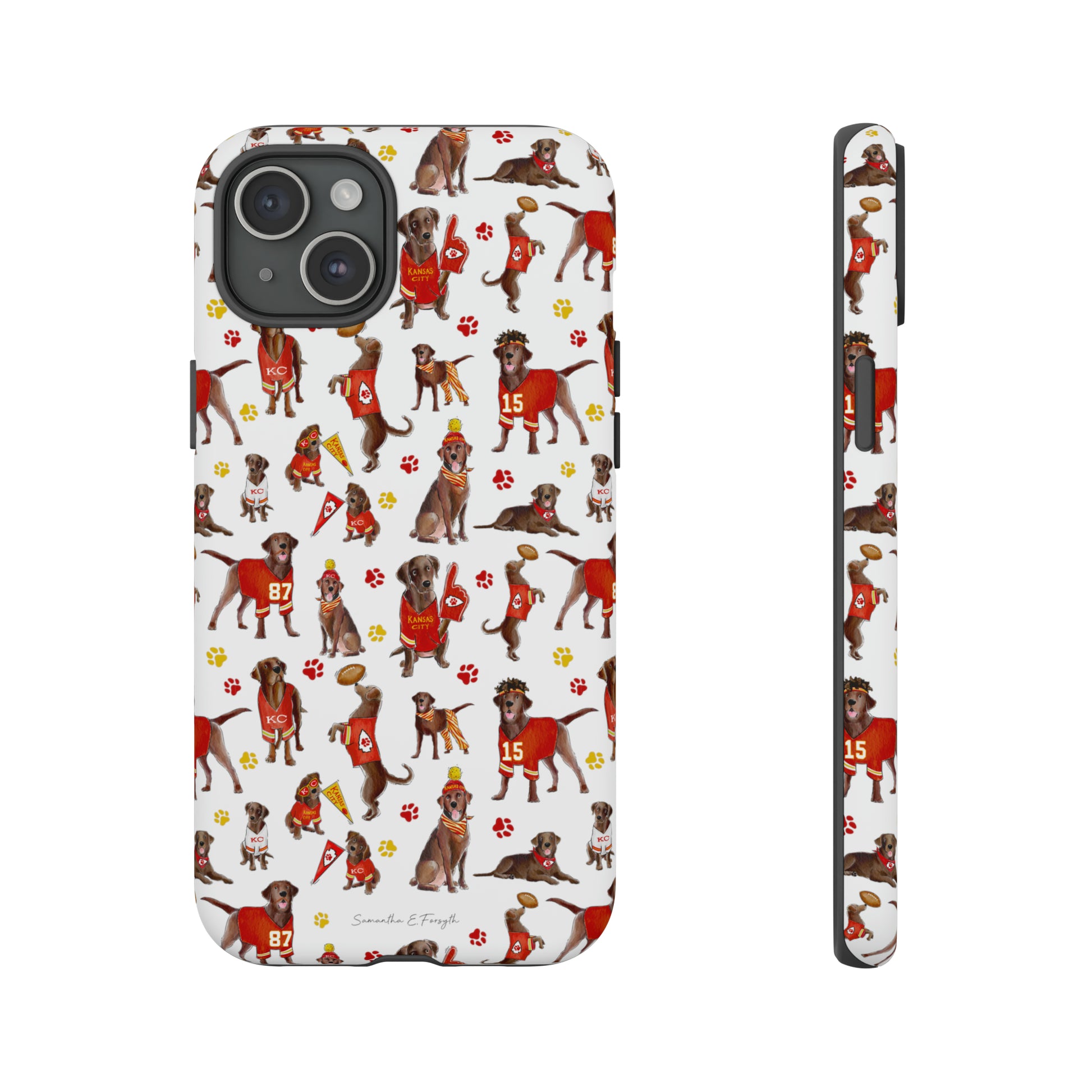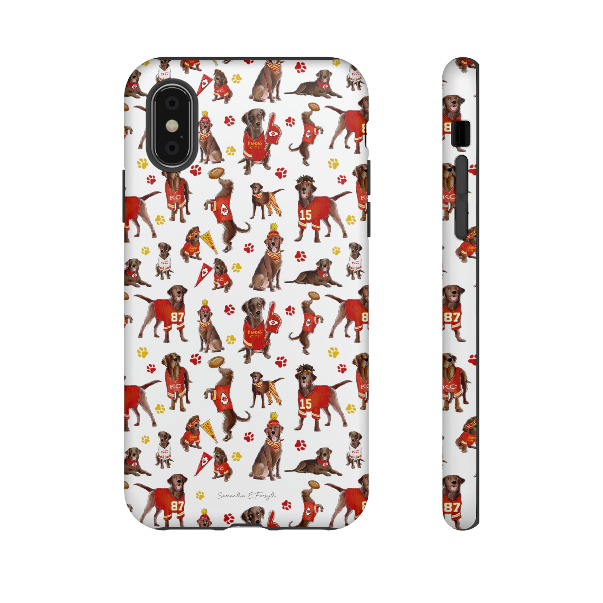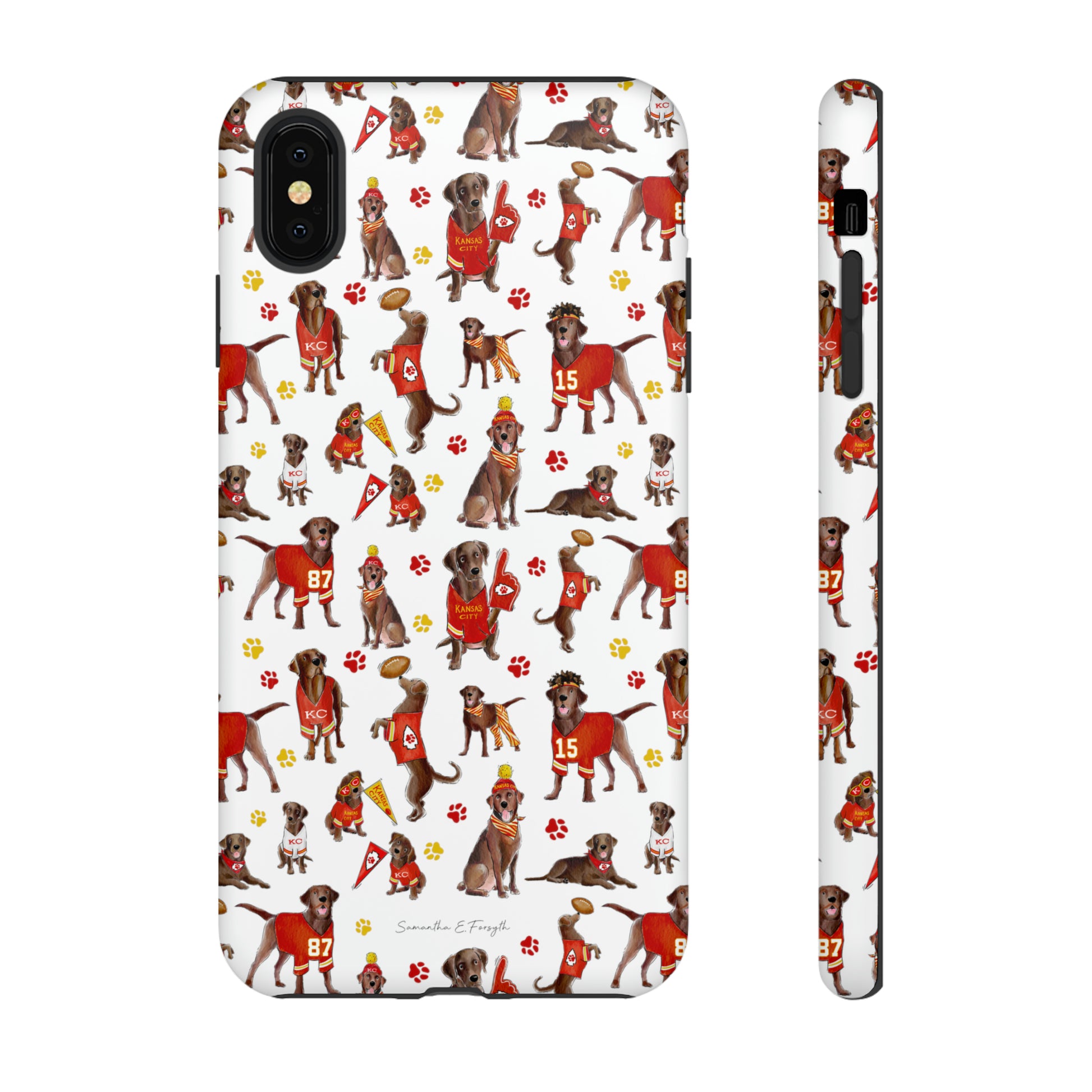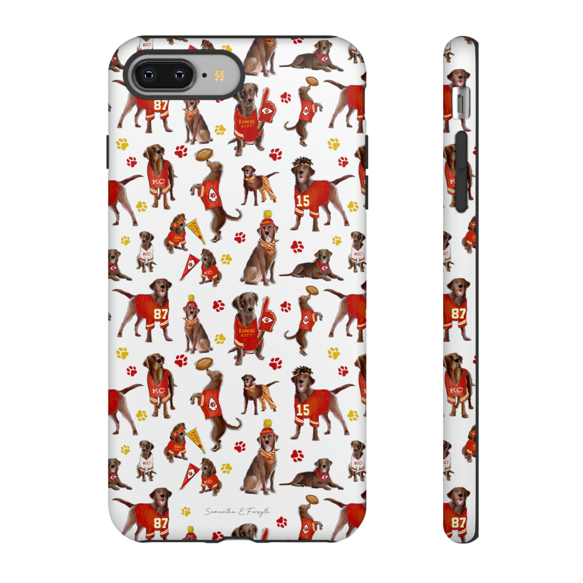 Introducing the ultimate accessory for all the doggy-loving, football fanatic phone owners out there! Our new phone case features Samantha's hand-drawn artwork of Chocolate Labs dressed in their finest KC jerseys. Not only will it give your phone a cute and unique look, but it's also super durable and will protect your phone from any drops, bumps or scratches. The rubber shell and protective lip absorbs impact and distributes shock, so whether you're at the game or just catching up on some doggone good tailgating, your phone will be safe and stylish. Show off your love for both man's best friend and football with this adorable phone case!