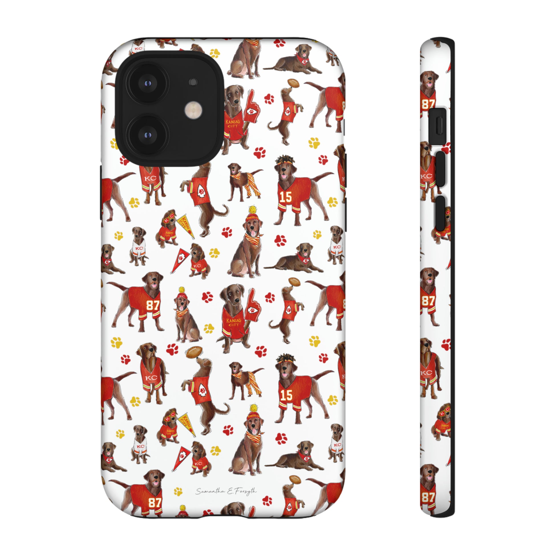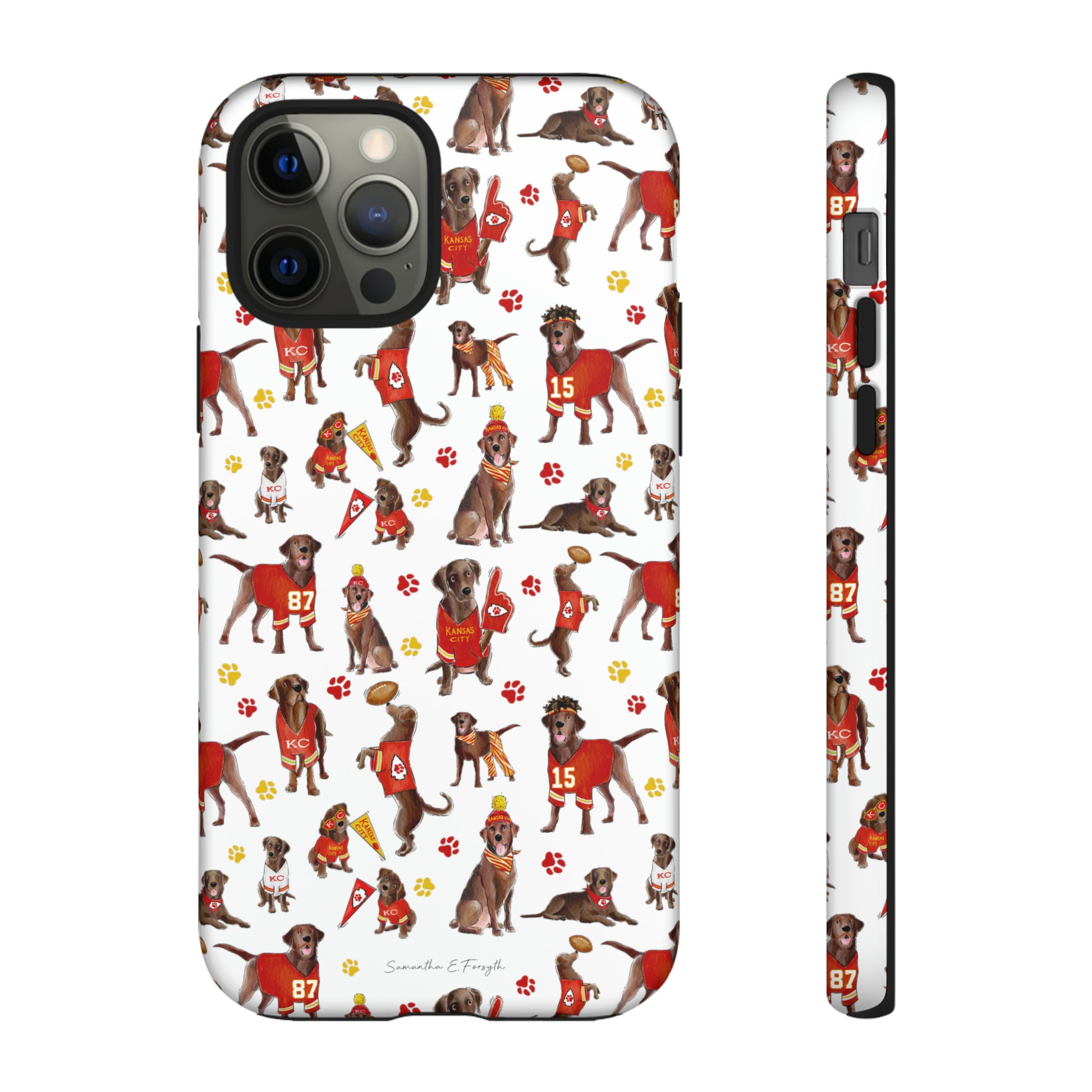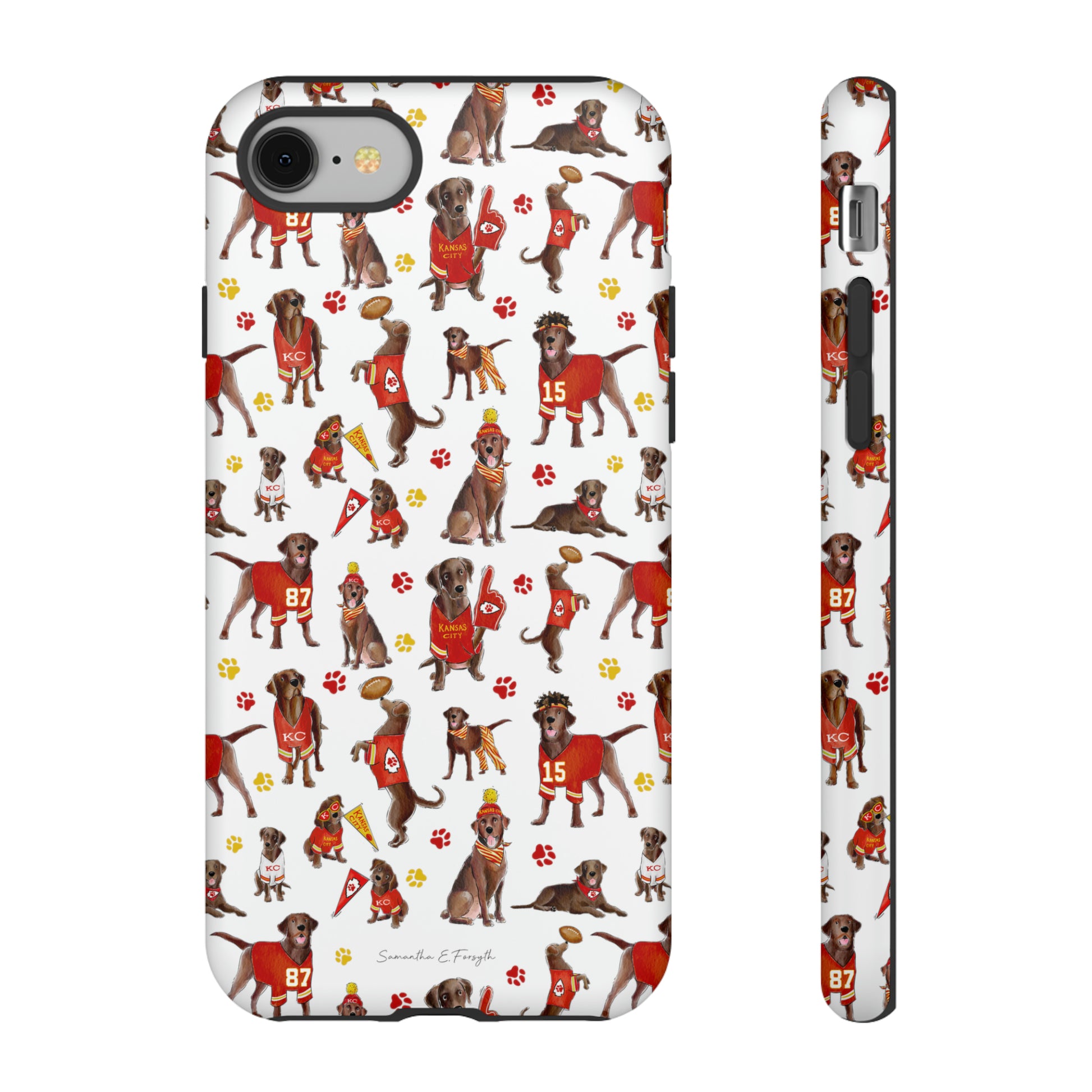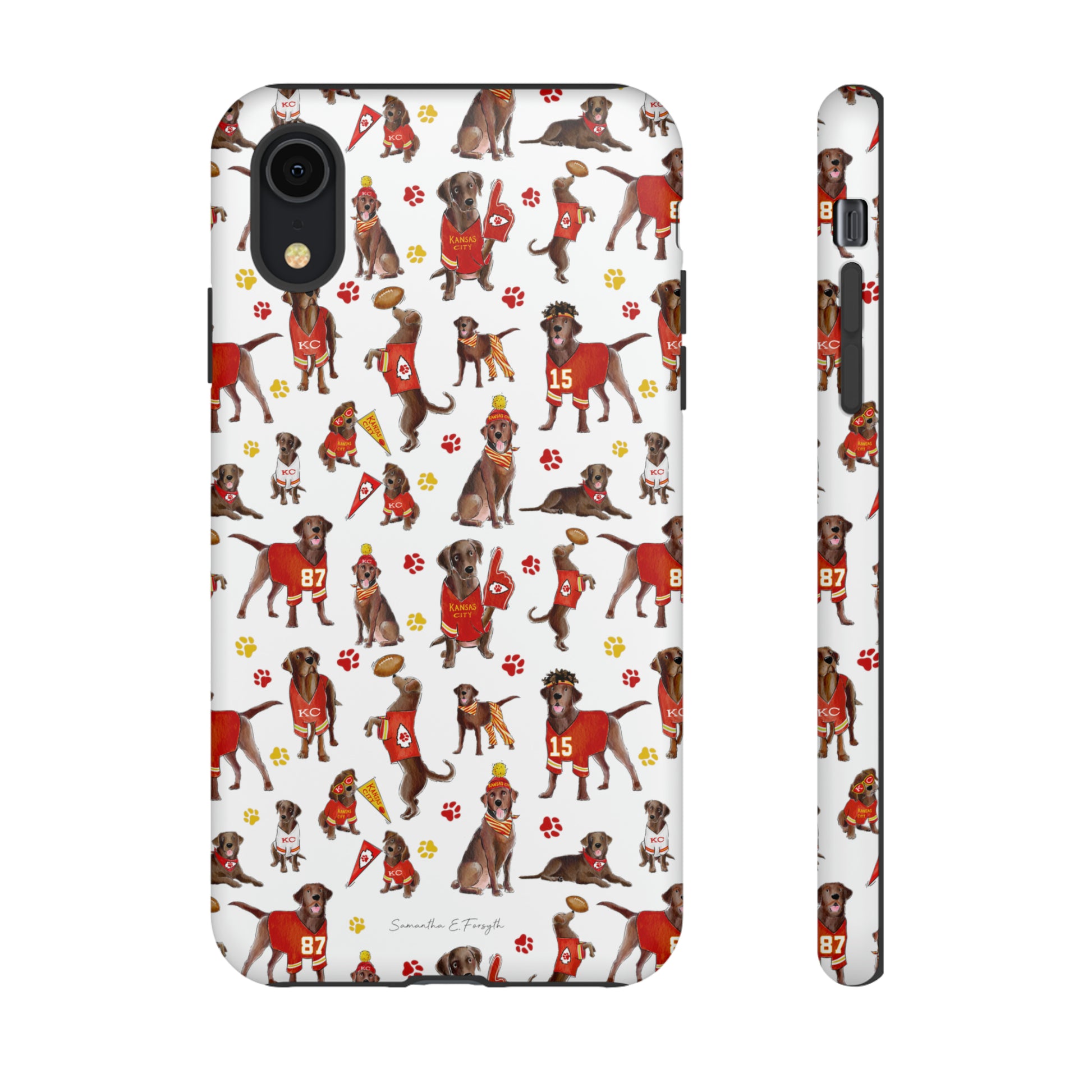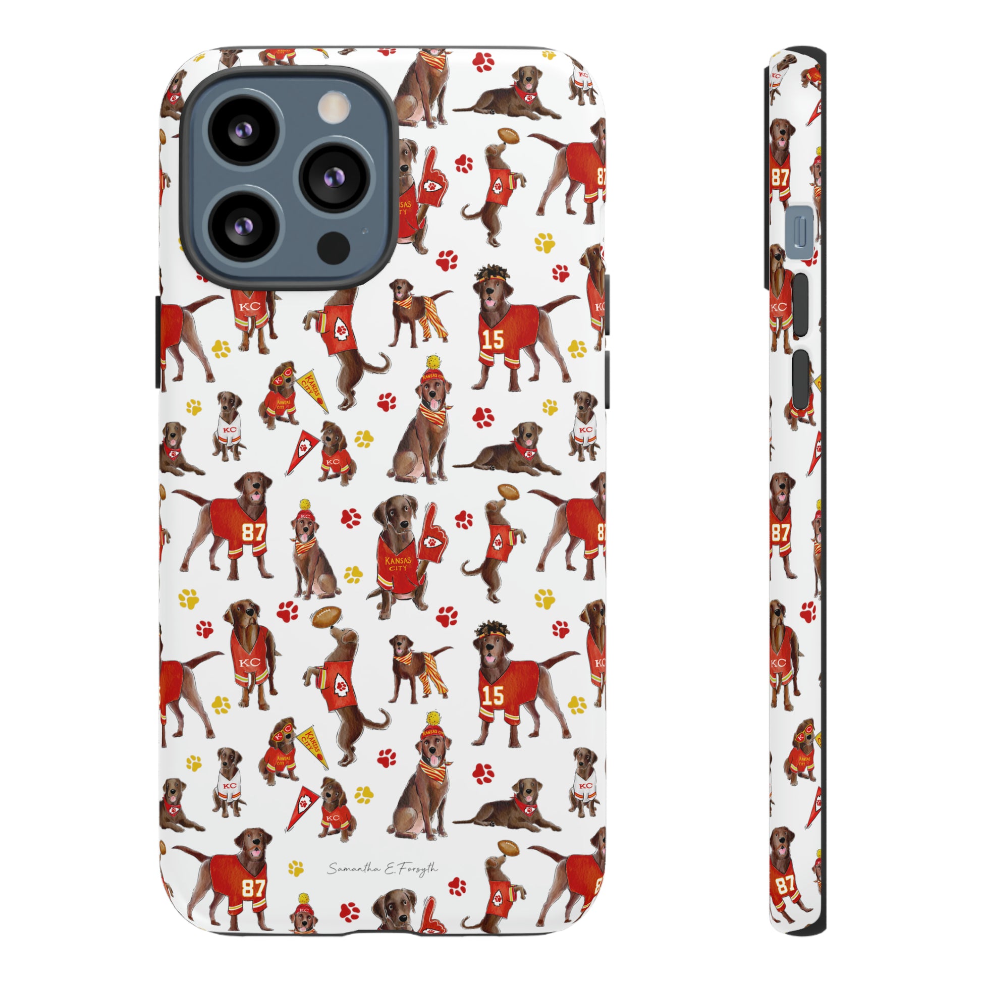 Introducing the ultimate accessory for all the doggy-loving, football fanatic phone owners out there! Our new phone case features Samantha's hand-drawn artwork of Chocolate Labs dressed in their finest KC jerseys. Not only will it give your phone a cute and unique look, but it's also super durable and will protect your phone from any drops, bumps or scratches. The rubber shell and protective lip absorbs impact and distributes shock, so whether you're at the game or just catching up on some doggone good tailgating, your phone will be safe and stylish. Show off your love for both man's best friend and football with this adorable phone case!