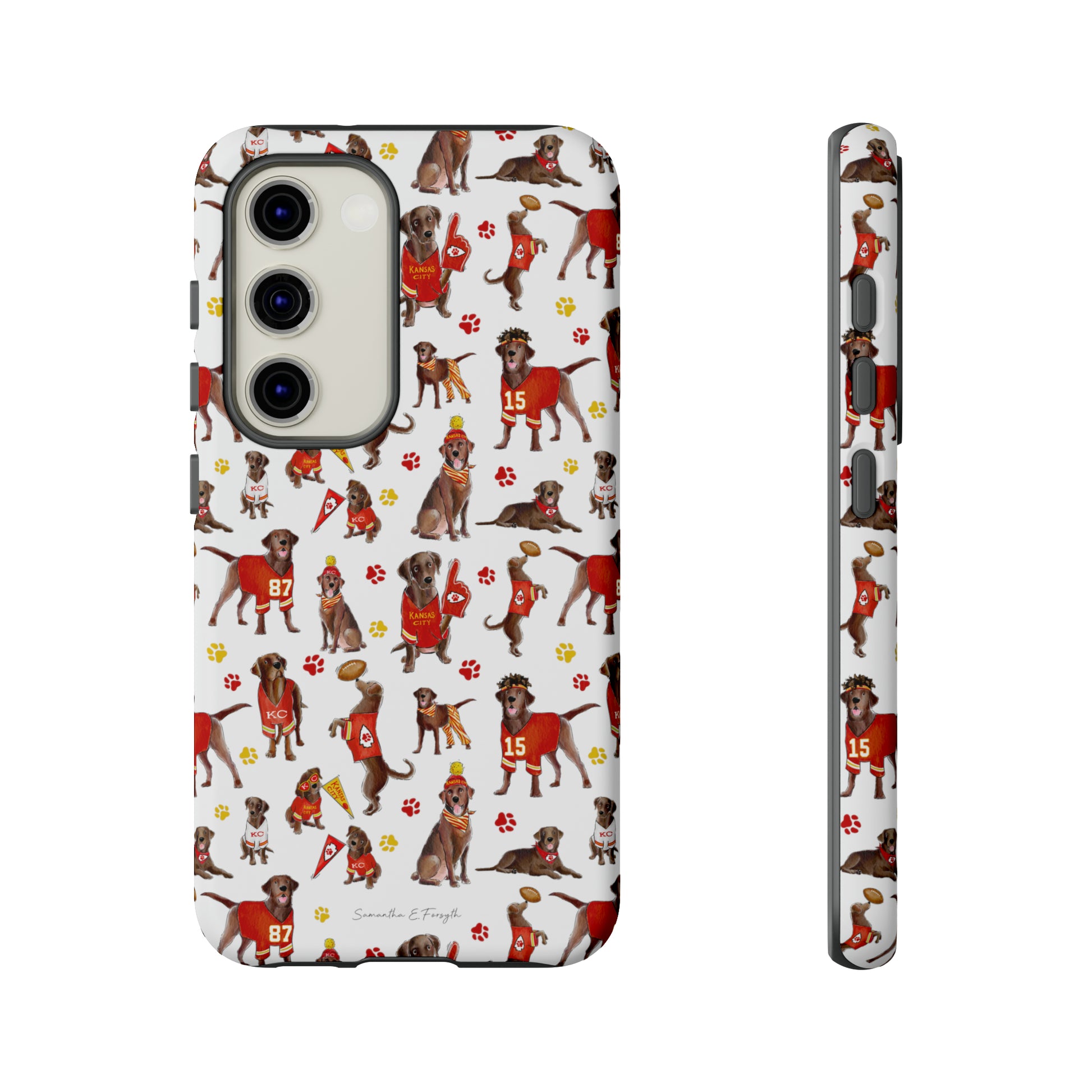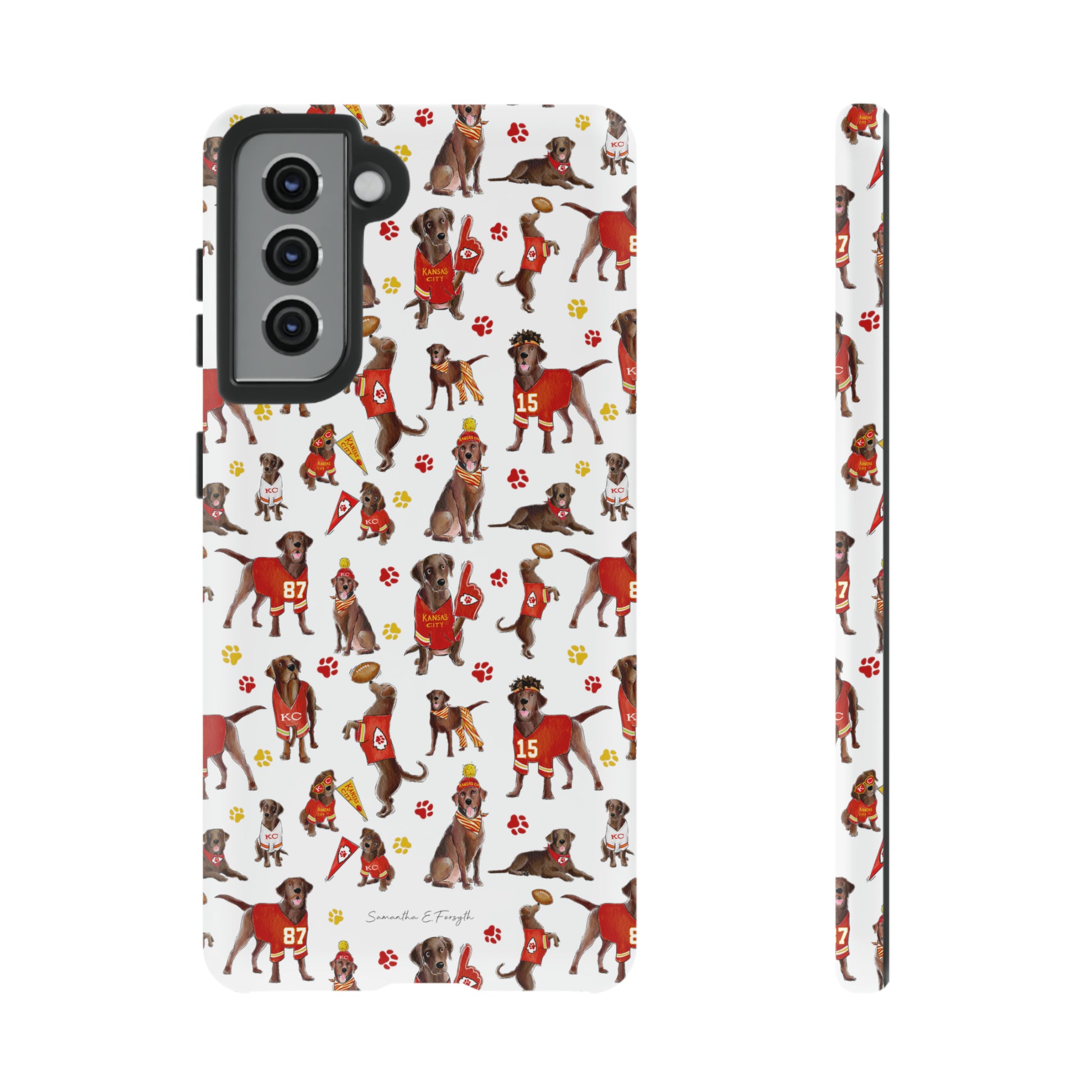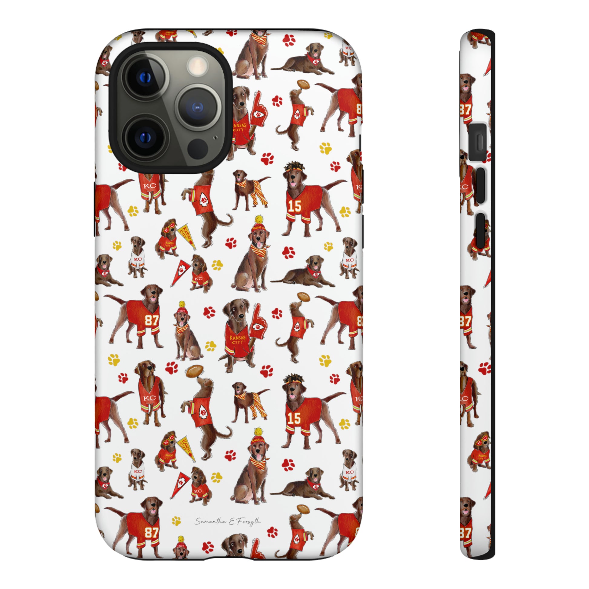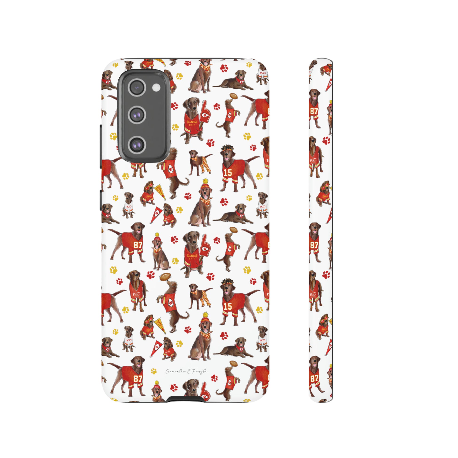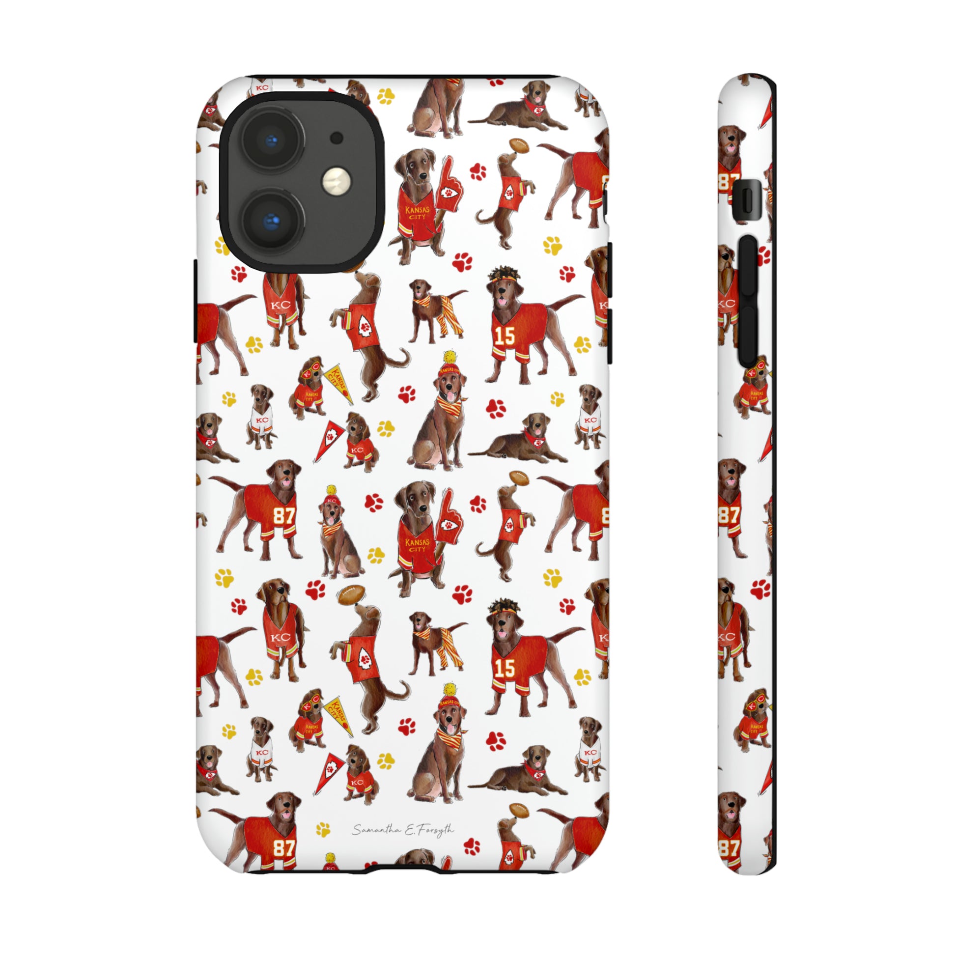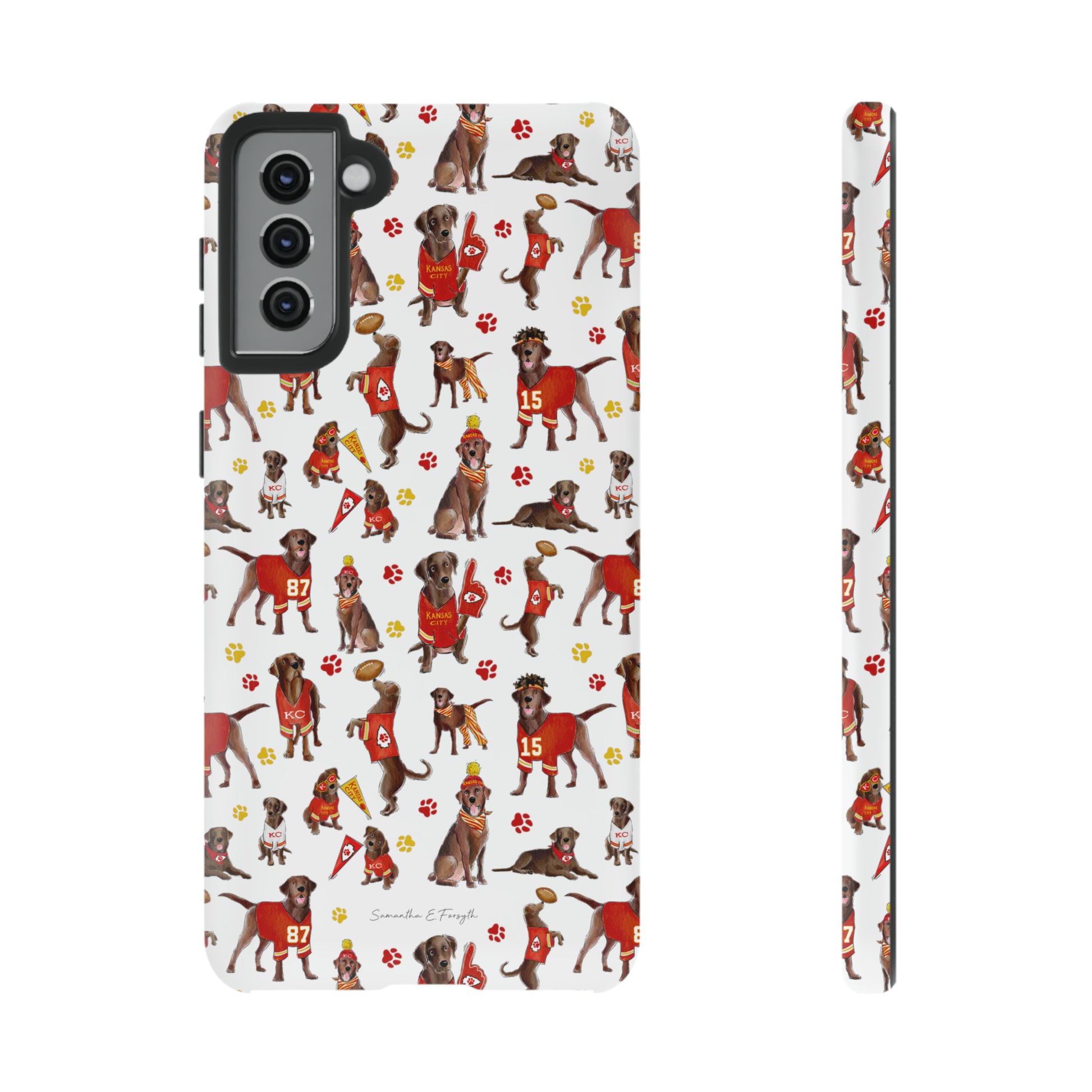Introducing the ultimate accessory for all the doggy-loving, football fanatic phone owners out there! Our new phone case features Samantha's hand-drawn artwork of Chocolate Labs dressed in their finest KC jerseys. Not only will it give your phone a cute and unique look, but it's also super durable and will protect your phone from any drops, bumps or scratches. The rubber shell and protective lip absorbs impact and distributes shock, so whether you're at the game or just catching up on some doggone good tailgating, your phone will be safe and stylish. Show off your love for both man's best friend and football with this adorable phone case!