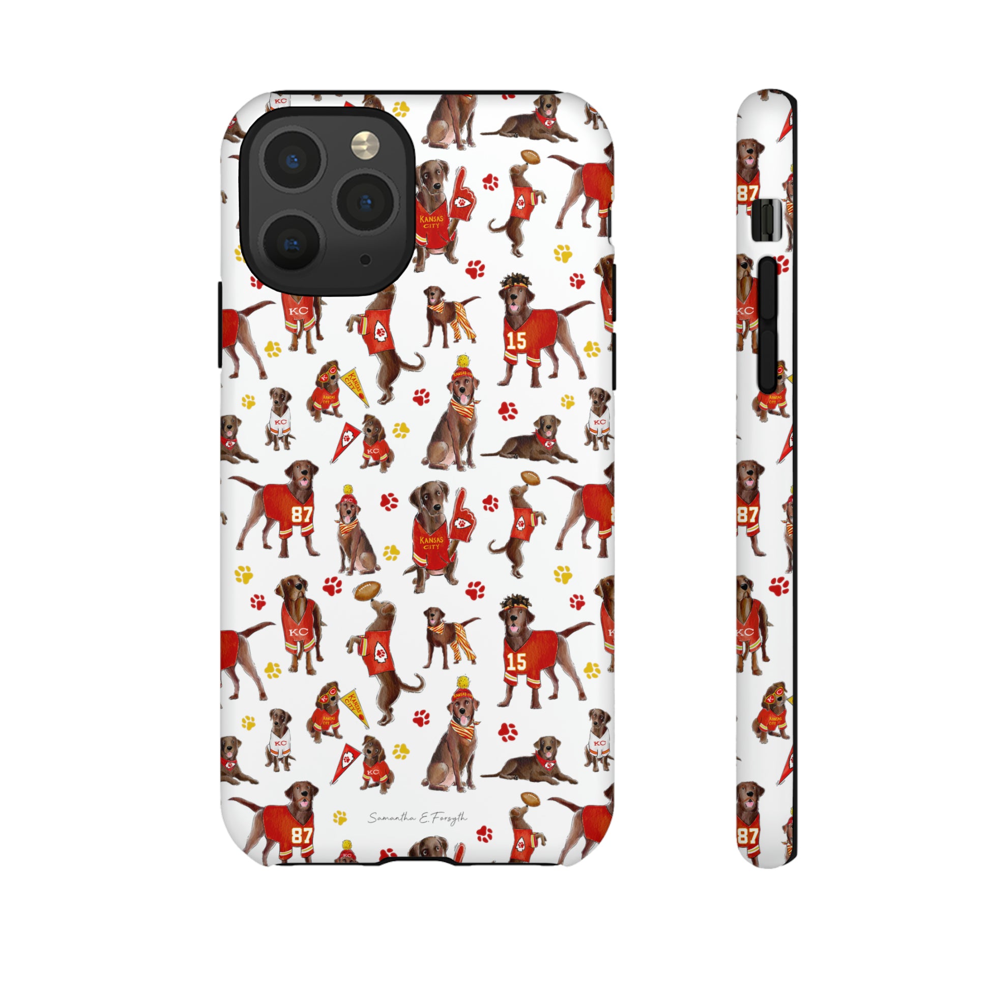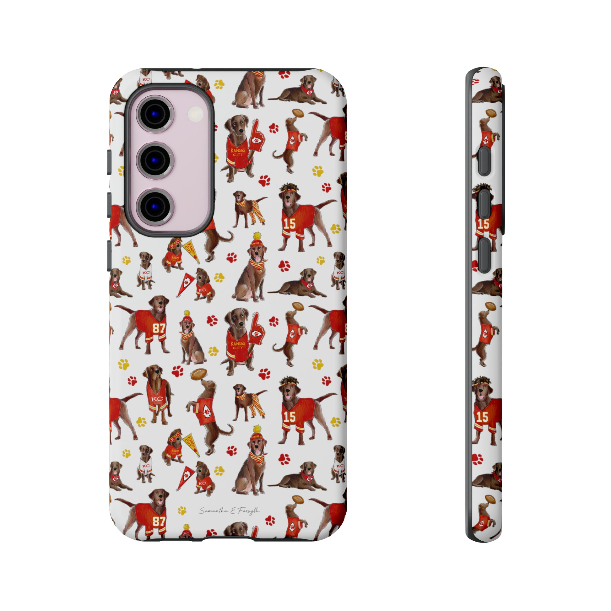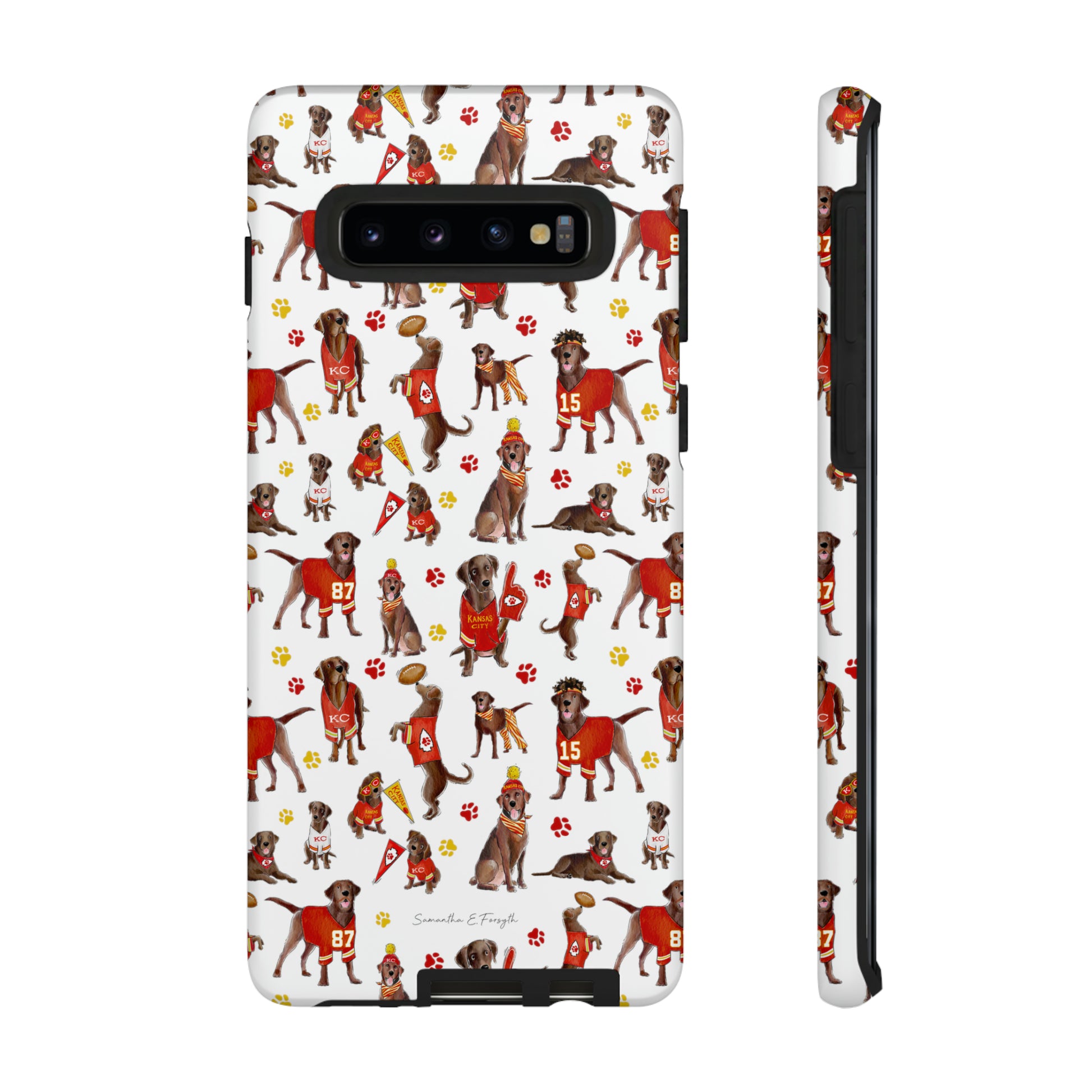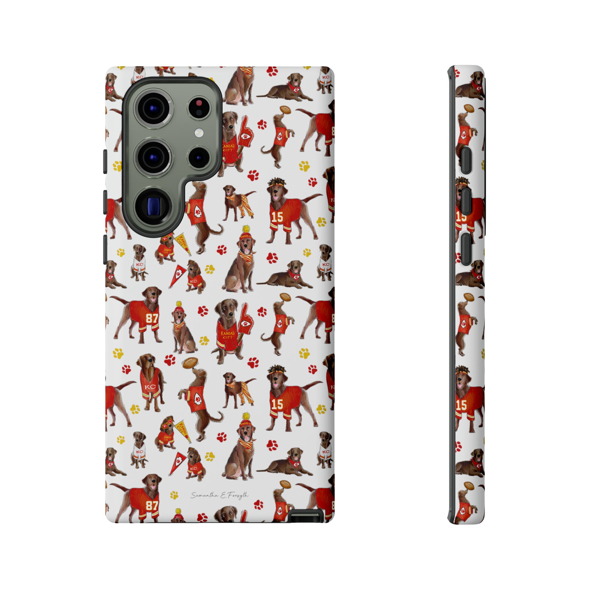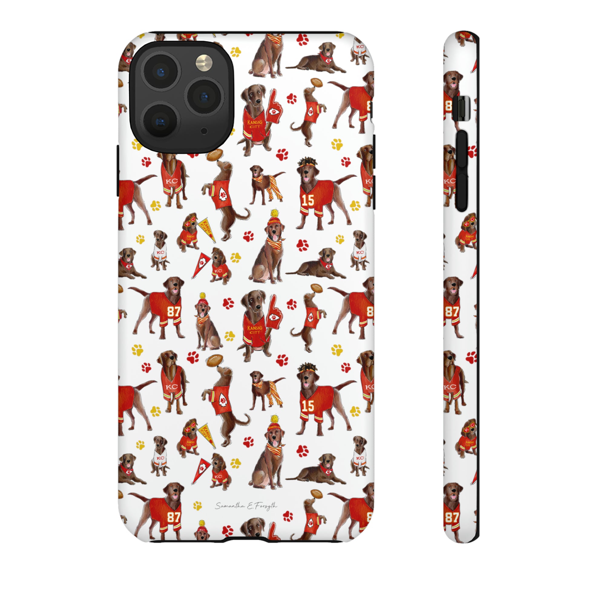Introducing the ultimate accessory for all the doggy-loving, football fanatic phone owners out there! Our new phone case features Samantha's hand-drawn artwork of Chocolate Labs dressed in their finest KC jerseys. Not only will it give your phone a cute and unique look, but it's also super durable and will protect your phone from any drops, bumps or scratches. The rubber shell and protective lip absorbs impact and distributes shock, so whether you're at the game or just catching up on some doggone good tailgating, your phone will be safe and stylish. Show off your love for both man's best friend and football with this adorable phone case!