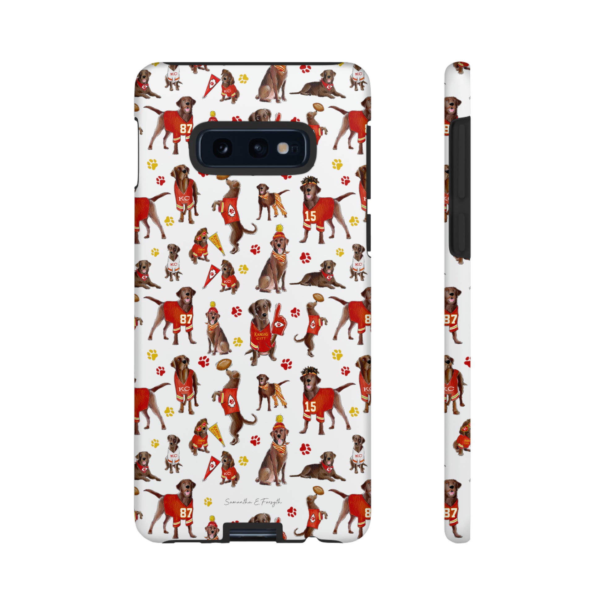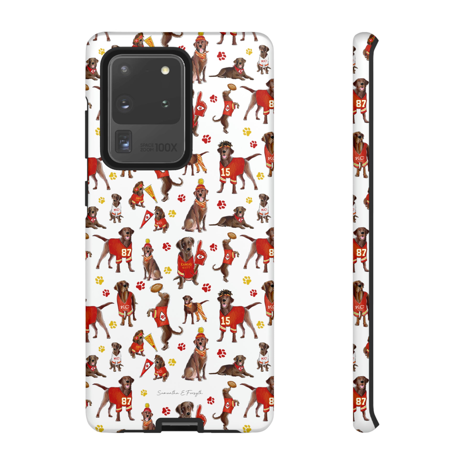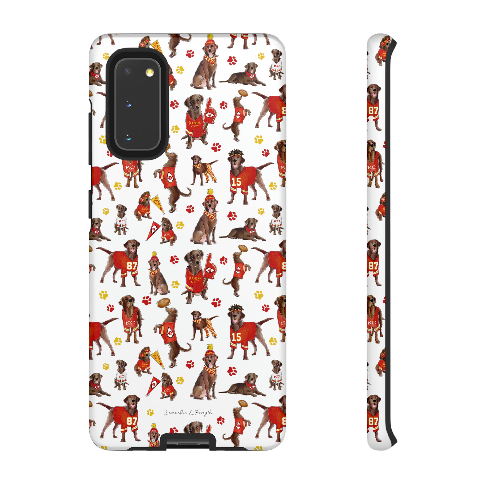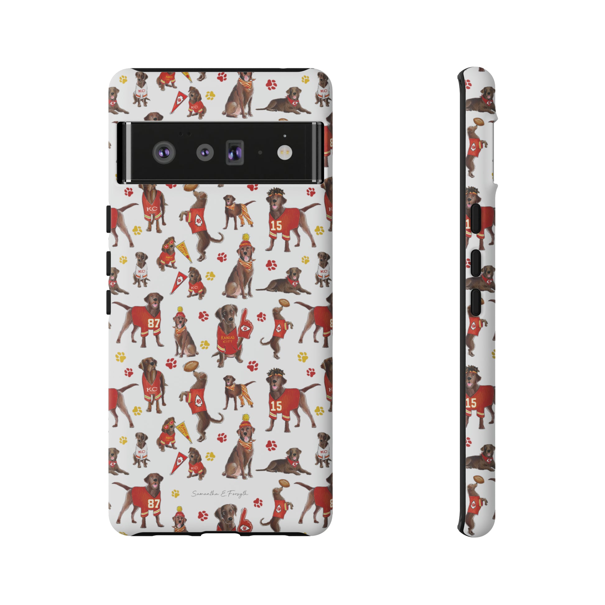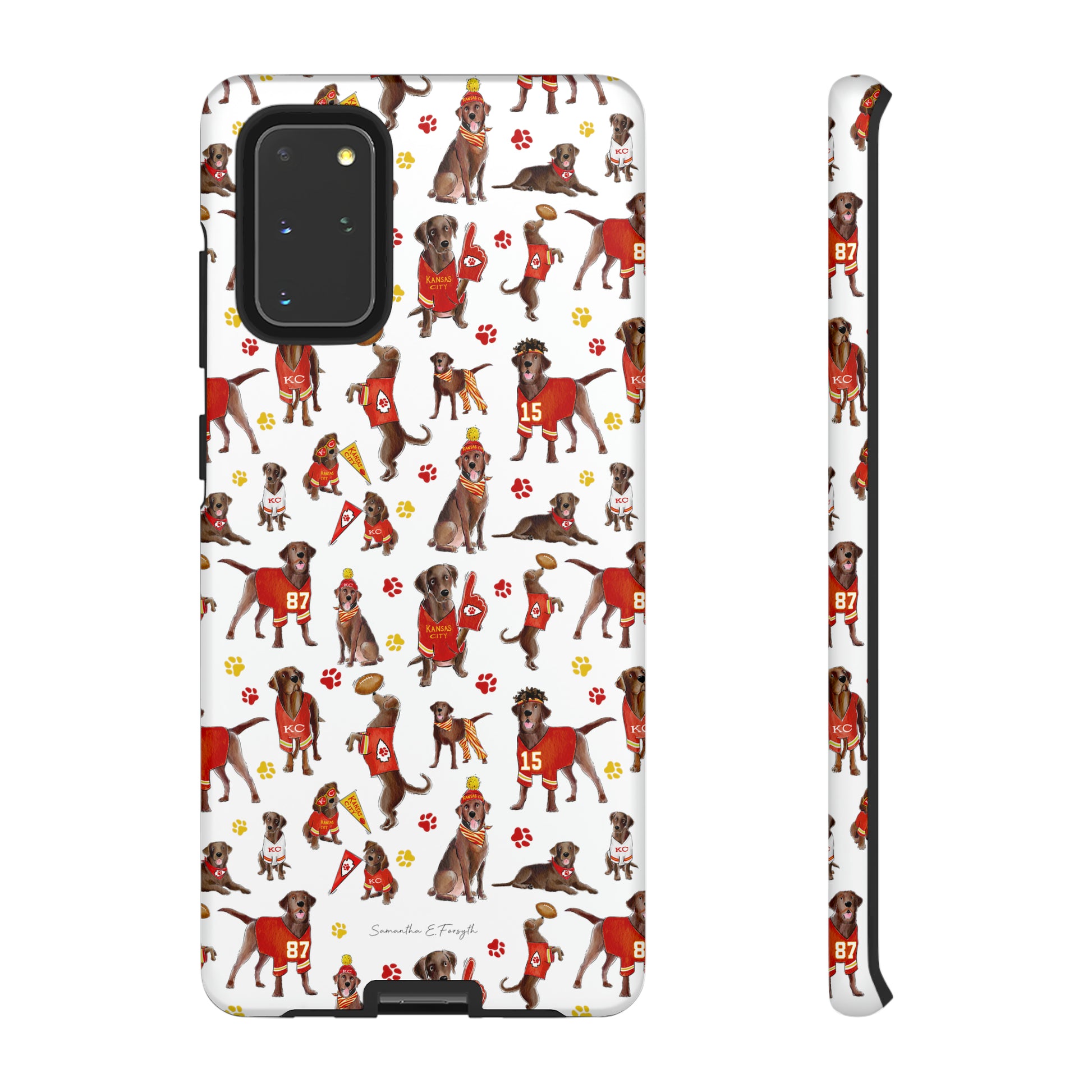 Introducing the ultimate accessory for all the doggy-loving, football fanatic phone owners out there! Our new phone case features Samantha's hand-drawn artwork of Chocolate Labs dressed in their finest KC jerseys. Not only will it give your phone a cute and unique look, but it's also super durable and will protect your phone from any drops, bumps or scratches. The rubber shell and protective lip absorbs impact and distributes shock, so whether you're at the game or just catching up on some doggone good tailgating, your phone will be safe and stylish. Show off your love for both man's best friend and football with this adorable phone case!