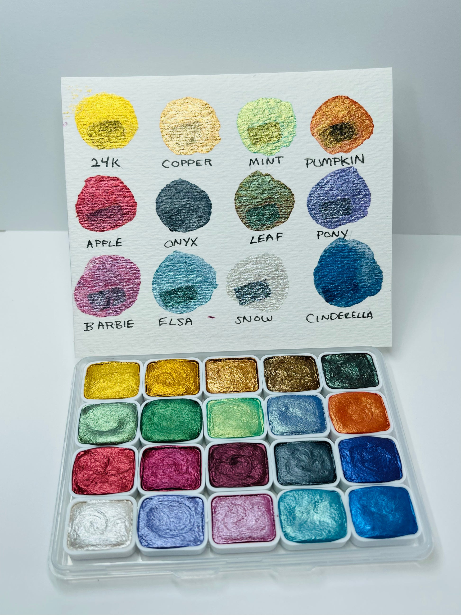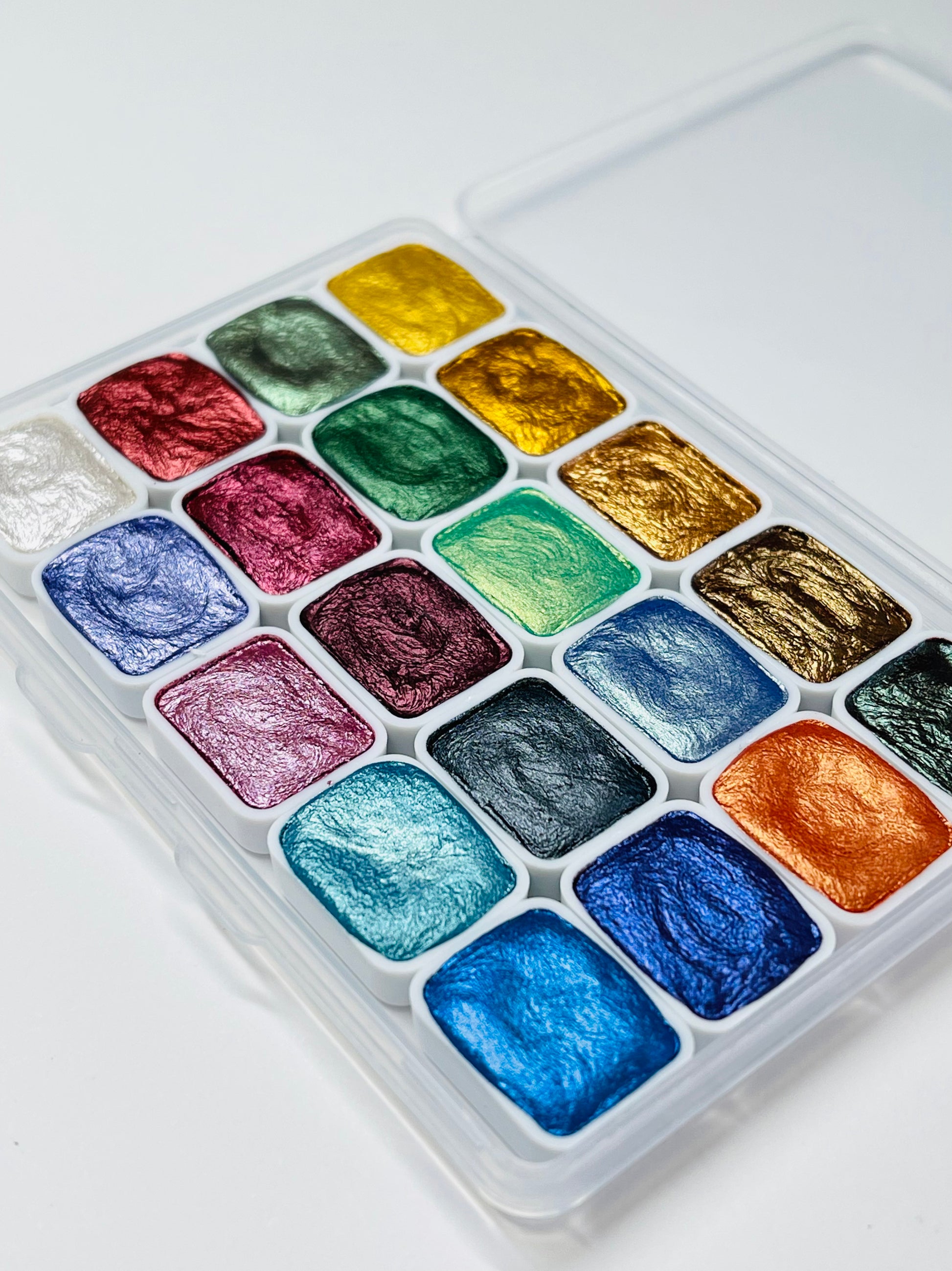 This gorgeous 20 color piece set is all handmade and includes every color you need! Please note that entire set measures about 4"x 2.5". Colors and color order may differ from photo. Each set is hand poured and handcrafted so please keep this in mind that every pan looks "perfectly imperfect" :)