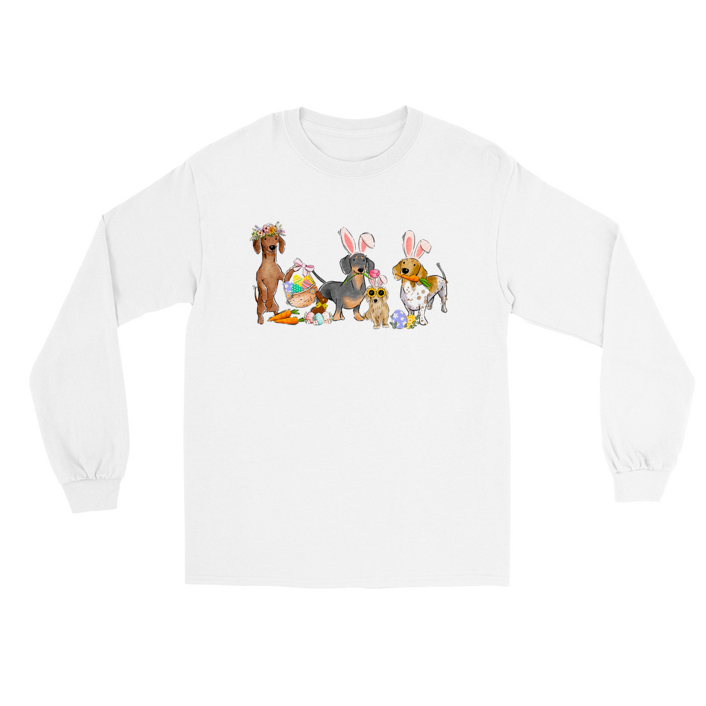 Hop into spring with SEF's Easter Long Sleeve Tees! Featuring Wieners hilariously dressed as Easter bunnies, each design is hand-drawn by Samantha herself, adding a personal touch to your holiday wardrobe. Not only is it adorable, but it's also as soft as a bunny's fur, ensuring maximum comfort while you spread Easter cheer! ๐ธ๐ถ๐ฐ