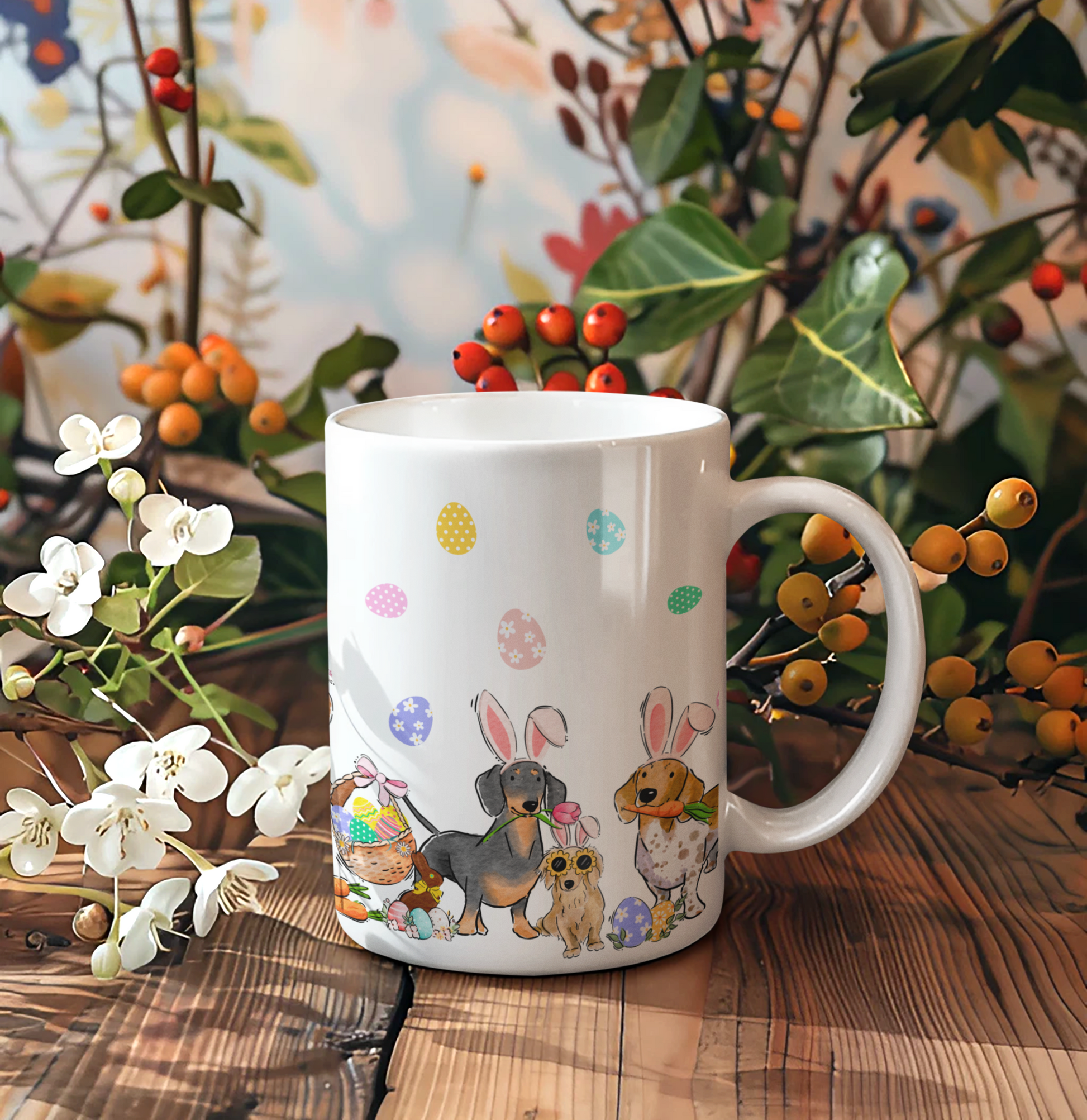 Sip in style with our Easter mug adorned with wieners hand-drawn by Samantha. This ceramic cutie comes in two sizes (small and large), perfect for your sipping preference, and it's dishwasher and microwave safe for ultimate convenience. Fetch now to elevate your coffee or tea experience with a touch of adorable charm 🐰🐣🐾
