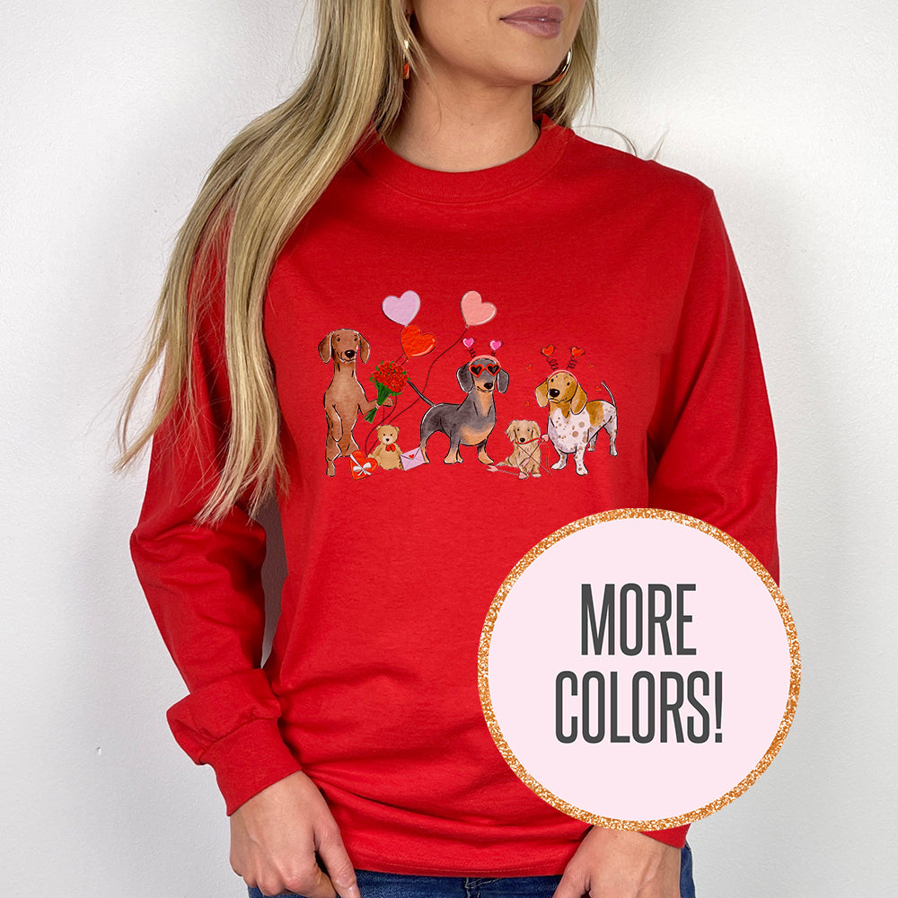 Unleash the cuteness with our exclusive Valentine's Day long sleeve tee, featuring Doxies drawn by Samantha. Crafted with a pre-shrunk jersey knit and a double-needle bottom hem, this long sleeve is a comfortable, everyday classic shirt that is perfect for relaxing on the couch or even working out. The perfect gift for dog lovers, it's a furry fashion statement that guarantees smiles and snuggles. 🐾💖